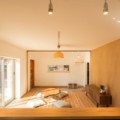 家族4人のためのこの住宅は、リビングに床座を取り入れています。